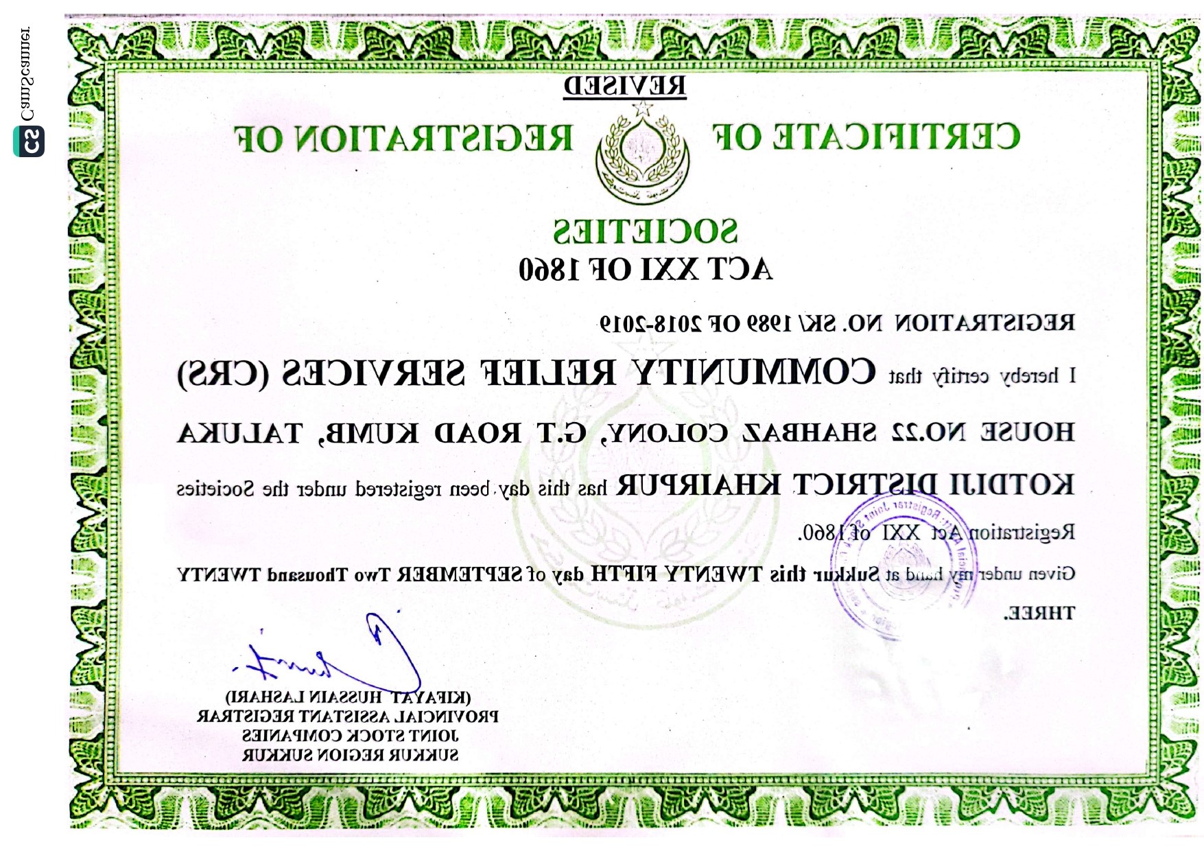 Ranewal Certificate - CRS